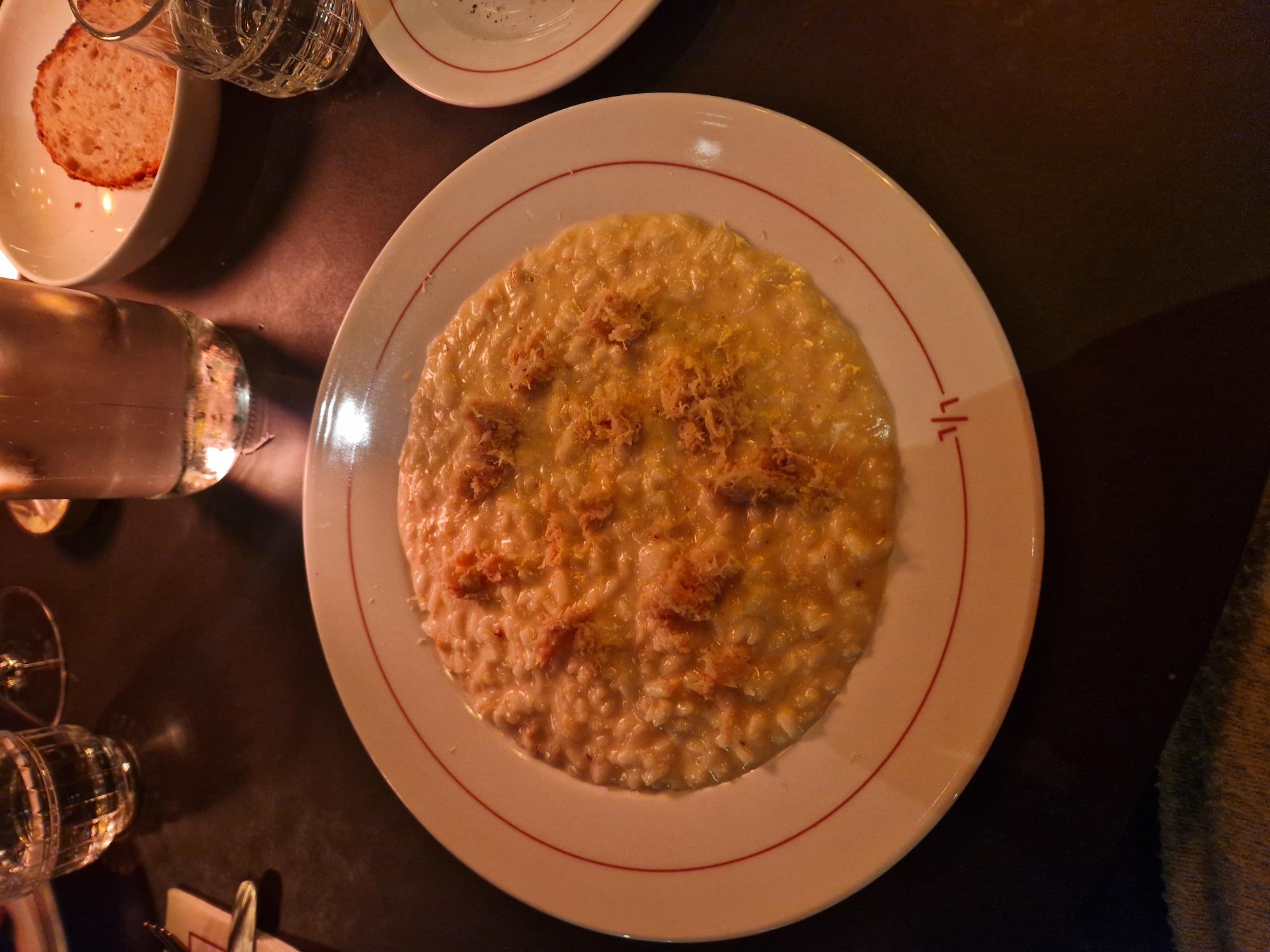 Rundt bordet kom det risotto med krabbe og sitron, dagens vilt - som var hjort, og dagens fisk - kveite.