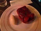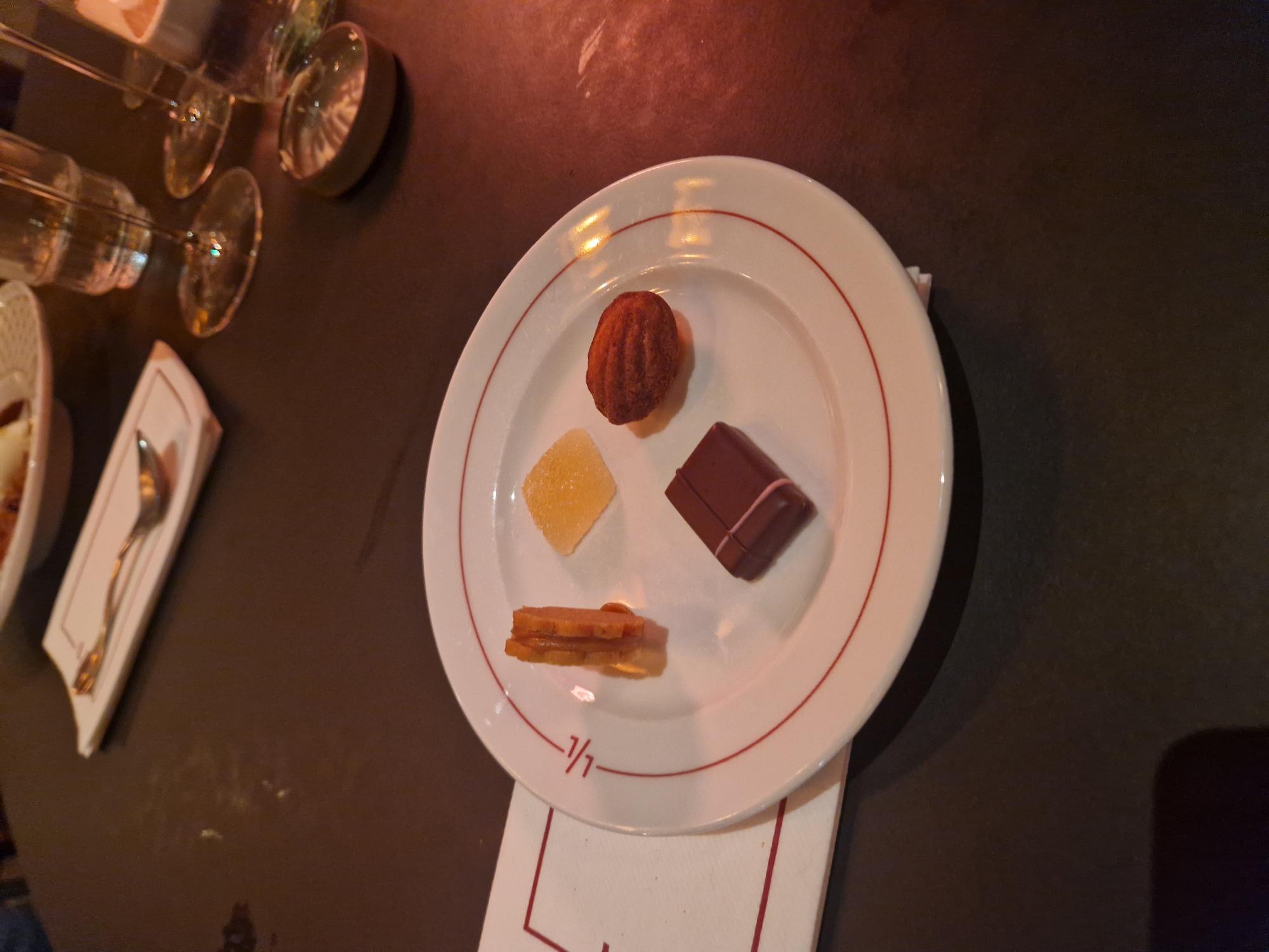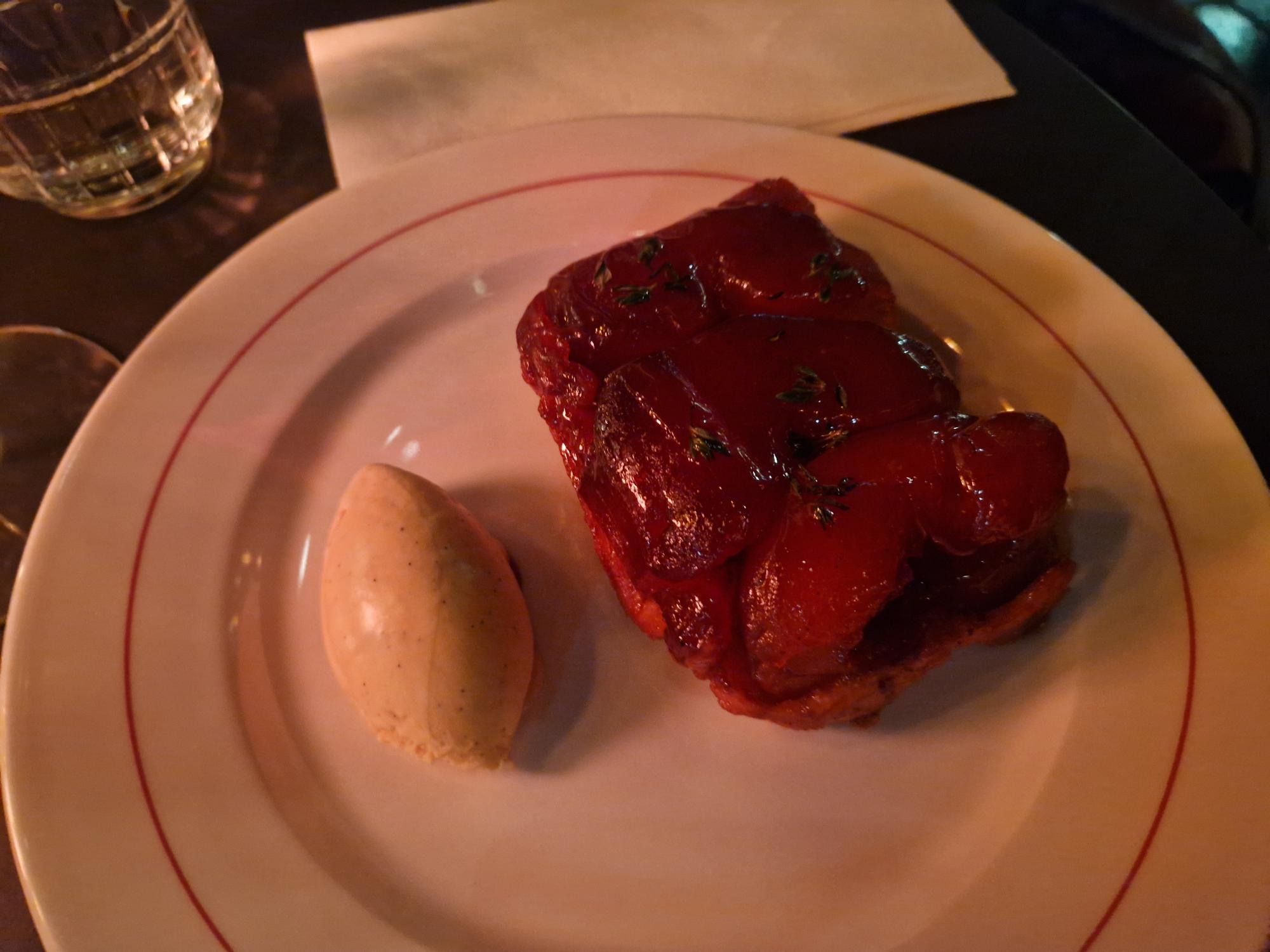 Til dessert bestemte to seg for tarte tatin, medan SJ og MO delte petit four (HURRA!! DETTE BØR ALLE RESTAURANTER HA! Vi kan aldri få sagt det nok...) og ein sjokoladecremeux med creme fraiche iskrem og diverse andre godsaker. Porsjonen med tarte tatin var massiv, og den sørga for å mette magane, medan dei andre var vanleg dessertstorleik så det får vi seie oss nøgde med.